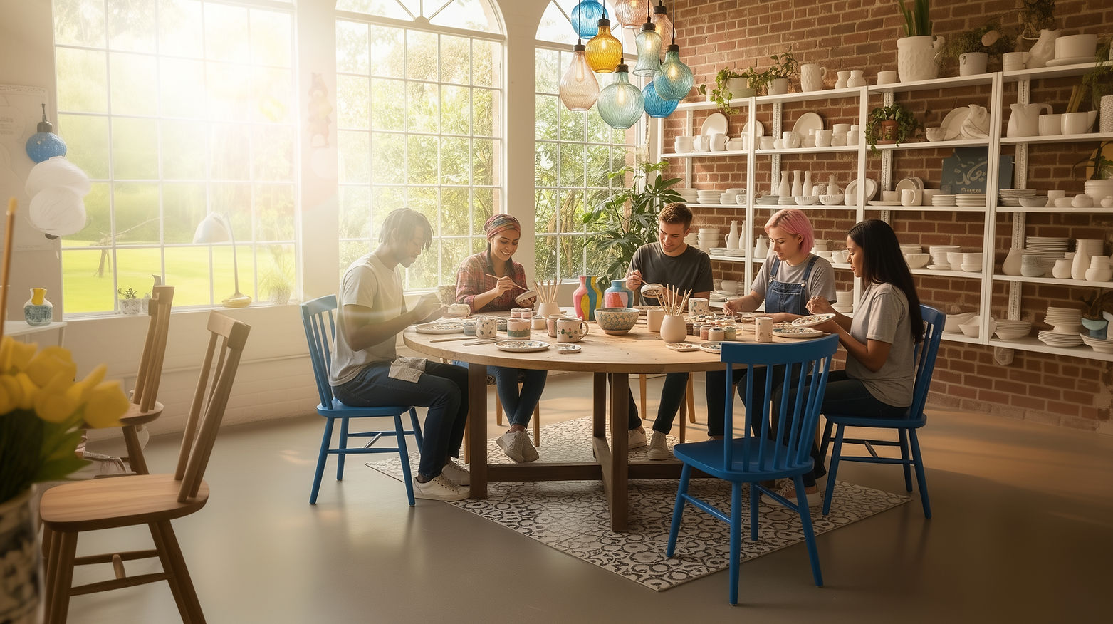 Keramikbemalen schafft einen Rahmen, in dem Menschen automatisch ins Gespräch kommen – ohne Spielchen, ohne peinliche Gruppenaufgaben. Hände beschäftigt, Köpfe entspannt, Gespräche fließen.
